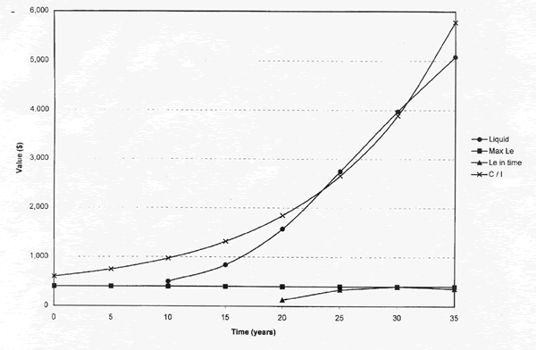 Second, the liquidation curve shows the merchantable volume that could be harvested over time from an acre planted to loblolly pine times the prevailing price for these particular assumptions. Timber production is assumed to be the highest and best use for the land. Even in this simple example, timber production is a capital intensive undertaking that involves land, establishment costs necessary to obtain adequate growing stock, and annual operating costs that must be committed to for long periods of time.